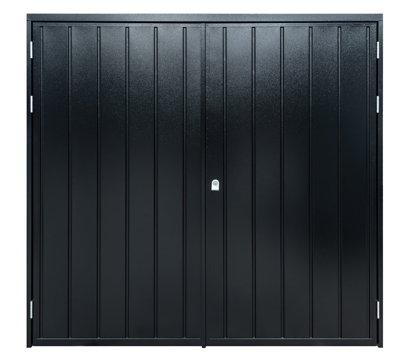 The side hinged Cartmel steel garage door is a vertical rib style door made from Magnelis steel. It is available in an off centre or centre split. The first opening door can be on either side and can open in or out. Opening only one side offers more privacy than an up and over door.